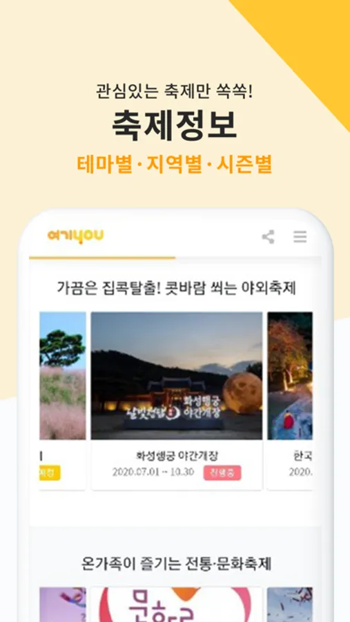 흥과 낭만이 가득한 축제와 즐거움과 힐링을 느낄 수 있는 체험! 365일 전국 축제와 체험, 여행정보를 '여기유' 하나로!