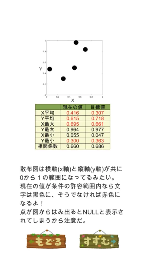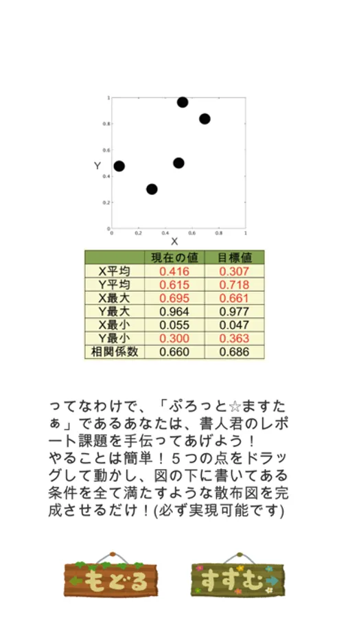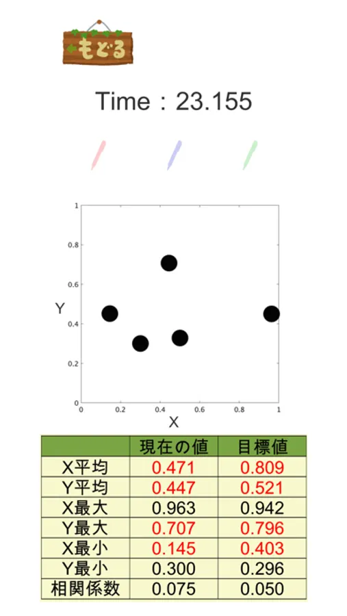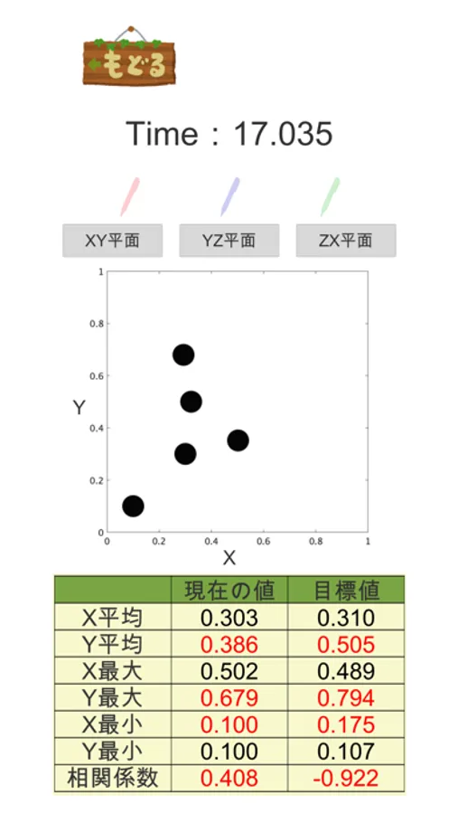 最大値や平均値などといった条件が与えられた時に、5つの点を動かすことによってそれらを全て満たす散布図(グラフ)をできるだけ早く完成させるというものです。2次元モードと3次元モードの2種類あり、前者は初心者向けで後者は慣れてきた人向けになっています。