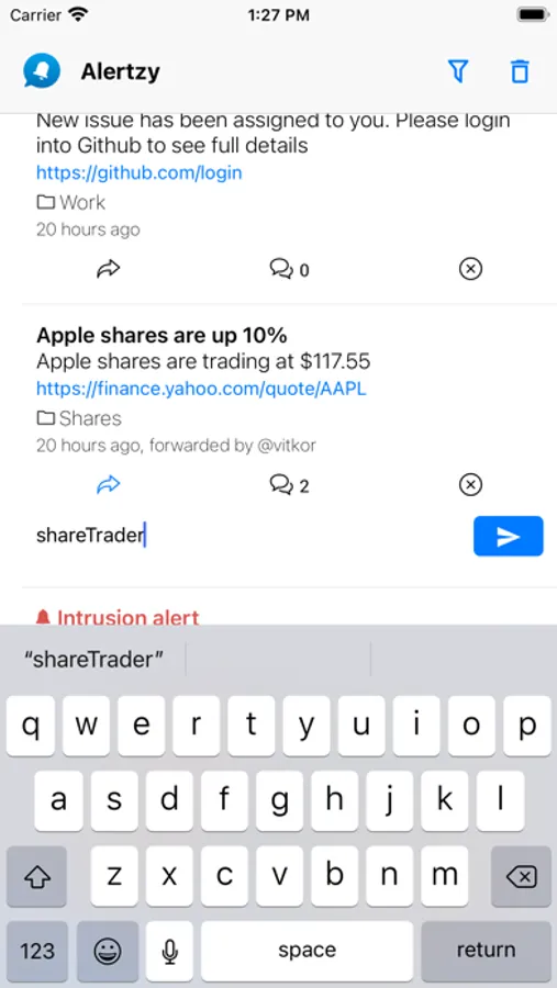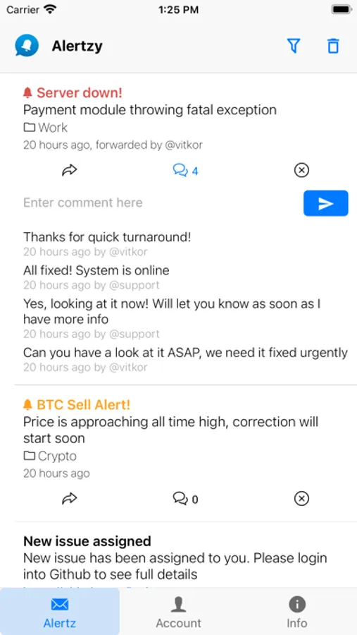 Alertzy is your ultimate alert management and team collaboration tool. Your team members will receive real-time push notifications on their mobile devices, keeping everyone in the loop. They can take action on alerts or easily forward them to the appropriate colleague for a swift resolution. All actions and updates are conveniently tracked within a single, user-friendly interface. Gain a historical view of issue progress and track its resolution over time.