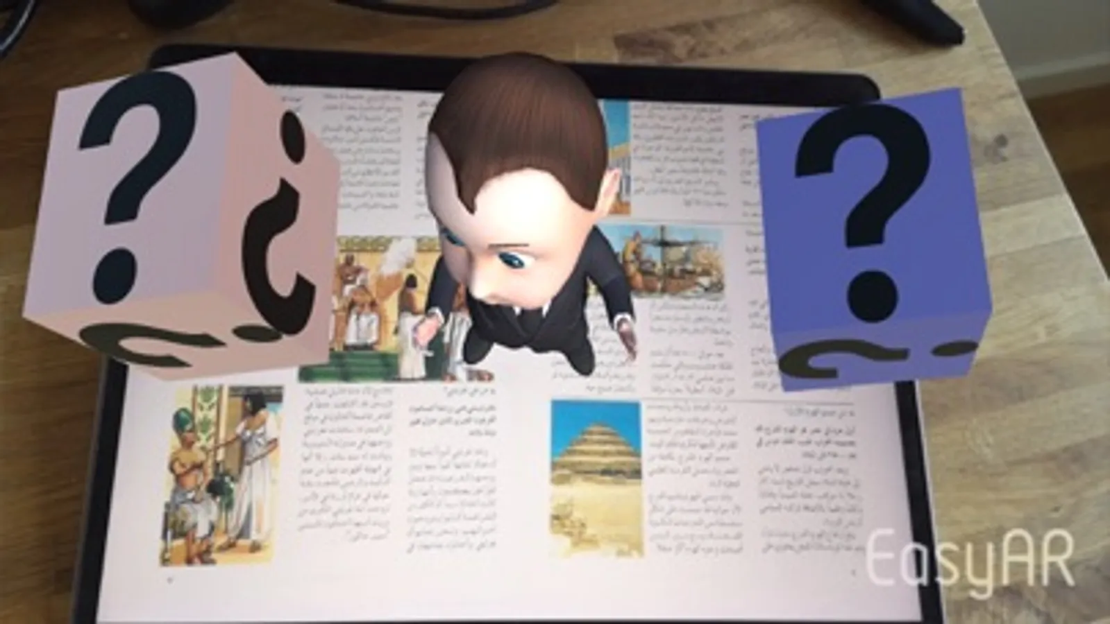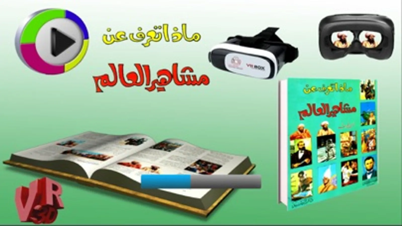 استمتع و تعلم مع كتاب المشاهير. كتاب تعليمي يضم مواضيع متعددة تم تطويره من خلال تصميم هذا التطبيق حيث يمكنك رؤية مجسمات ثلاثية الأبعاد و أزرار تظهر على سطح الصفحة على شكل مكعب ويحدث ذلك عندما تستخدم كاميرة التطبيق بحيث يتعرف على الصفحة و لكل صفحة مجسمات و ازرار خاصة بها و هذا ما يسمى بالواقع المعزز. عندما تضغط على الزر المكعب يظهر صفحة جديدة مع عدة خيارات كمشاهدة فيديو يتكلم عن الصفحة الحالية او مشهد ثلاثي الابعاد باستخدام النضارة الخاصة بالواقع الافتراضي.