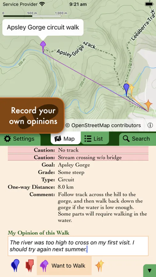 Once out in the wilderness, the map and tracks remain visible even when out of reach of mobile networks. Then record your opinions of your completed journey, or plan your next bushwalk.