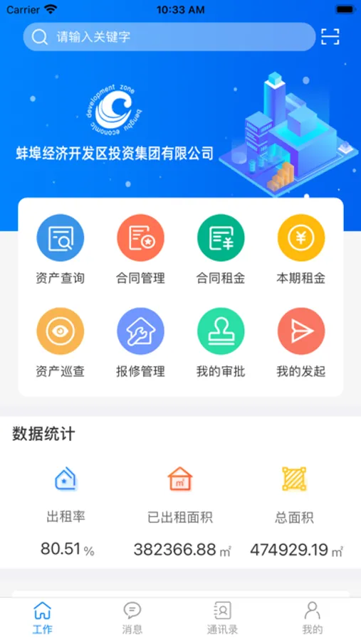 主要功能包含资产信息查询、合同查看、租金登记、安全巡查、在线报修、审批管理、通知消息等功能,为房产租赁人员提供便利
