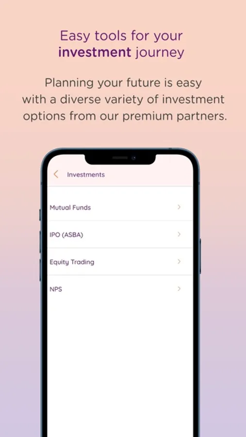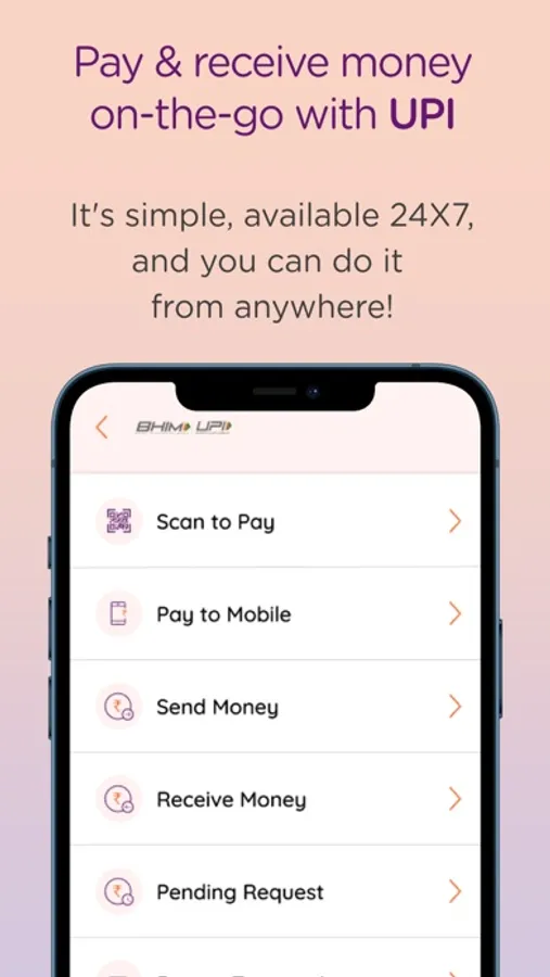 • Transfer funds using various payment options: IMPS, NEFT, RTGS, UPI & Scan and Pay
