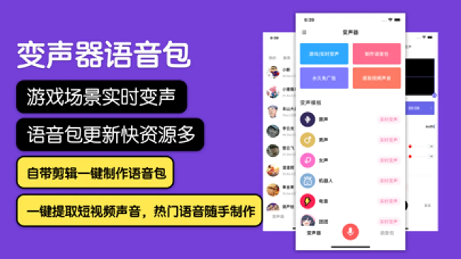提供众多常用的变声模板和全套的语音包制作剪辑工具,语音包键盘方便用户在聊天和游戏时实时变声,试用后可解锁全部模板,声音,功能,并关闭全部广告,仅限3天。