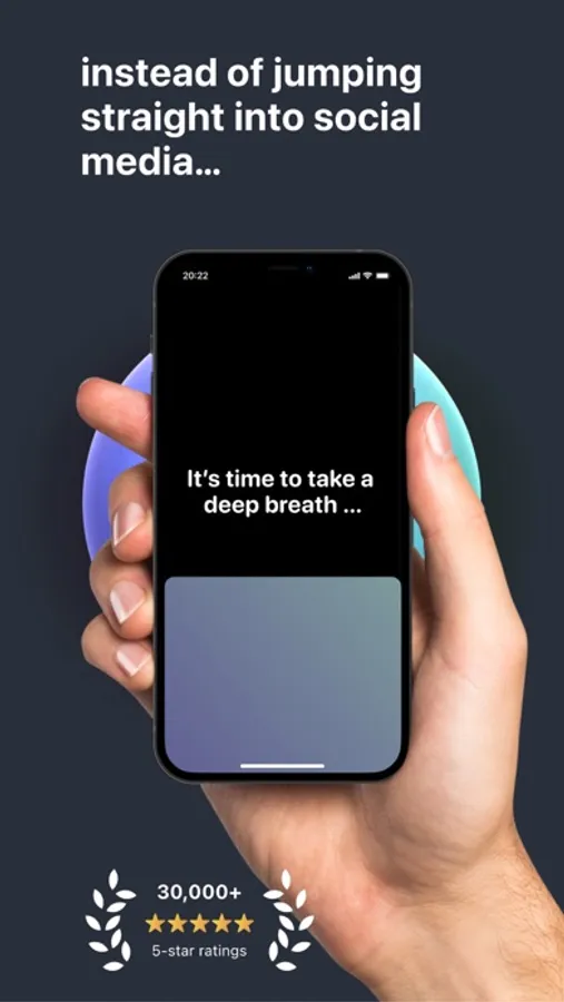 “one sec” uses Shortcuts Automation to toggle a deep breath animation whenever you open one of the configured apps (Instagram, Twitter, YouTube…). This breaks unconcious social media habits short-term (literally, as soon as you have set it up) and even helps long-term by adding more friction when opening these apps.