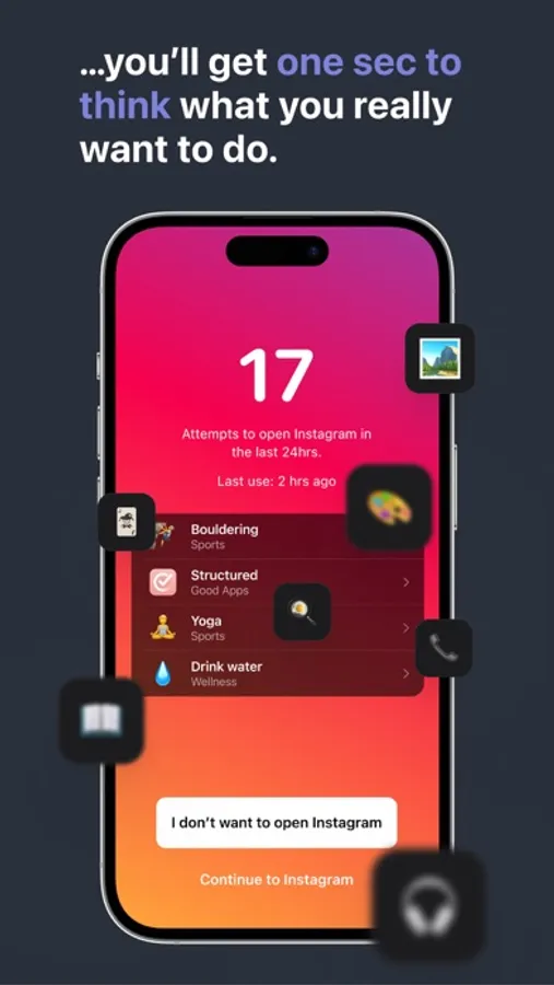 In contrast to Screen Time, one sec delays access to apps and websites instead of blocking them completely – this is fundamentally different than any other screen time tool you’ve tried before!