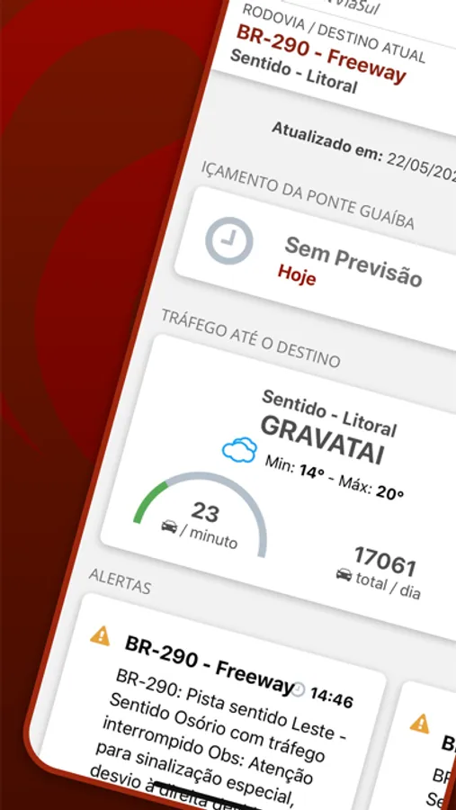 Veja em seu trajeto as informações sobre o tráfego das rodovias, valores dos pedágios, condições climáticas, pontos de serviços e receba alertas e boletins via notificação.