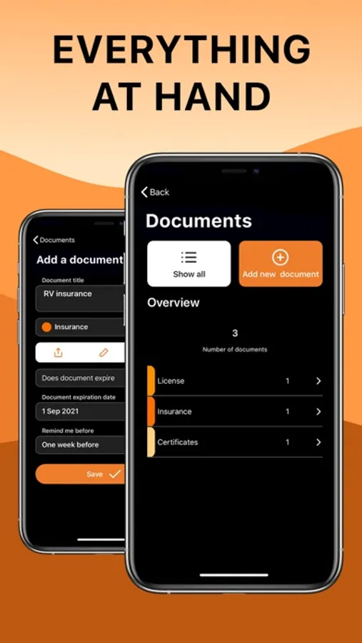 DOCUMENTS - have all documents at hand, with expiration alarms and for easy export/email (pdf, jpg).