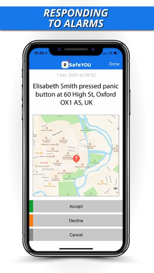 The 2SafeYOU App can be used to handle alarms being dispatched from the server software solution. Alarms are pushed from the 2SafeYOU server software solution to the App so assigned users can handle alarms. This includes the ability to accept, decline or cancel alarms while at the same time informing all other users in real-time about the alarm handling status.