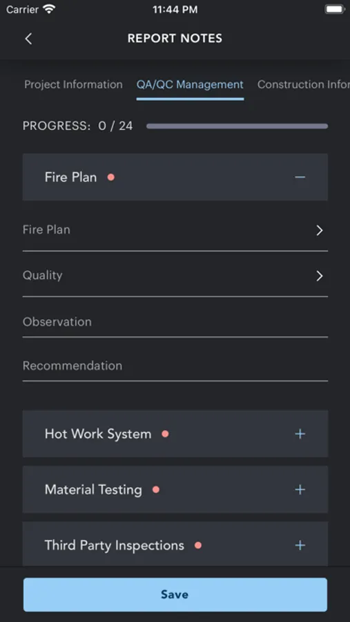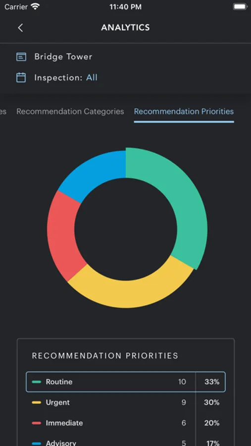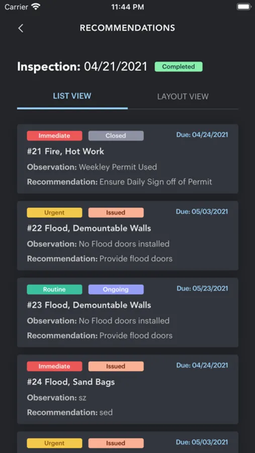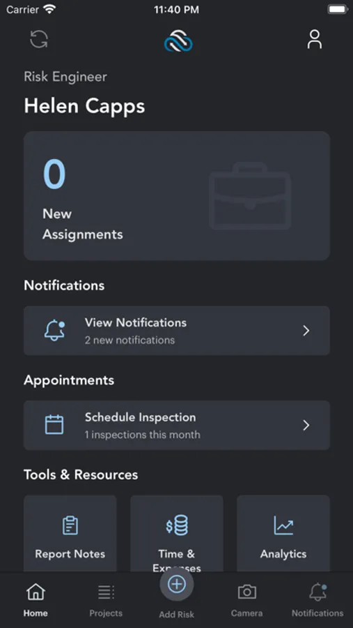 The application has a dashboard to help the Risk Engineers in the field perform inspections with ease. Specialists can collect risk information using our report notes feature, determine likelihood and severity of risk, record time & expense, add images and videos to risk items, and review underwriting information at the touch of a button.