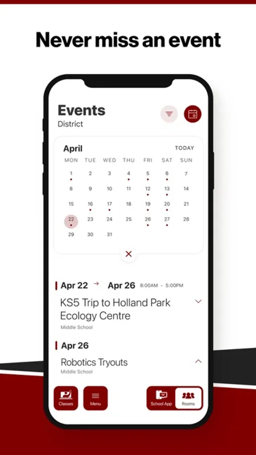 The event section shows a list of events throughout the district. Users can add an event to their calendar to share the event with friends and family with one tap.