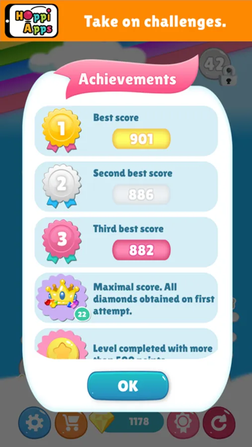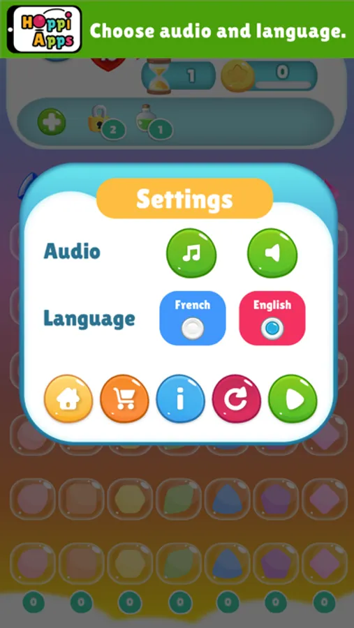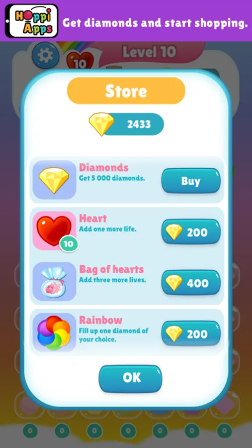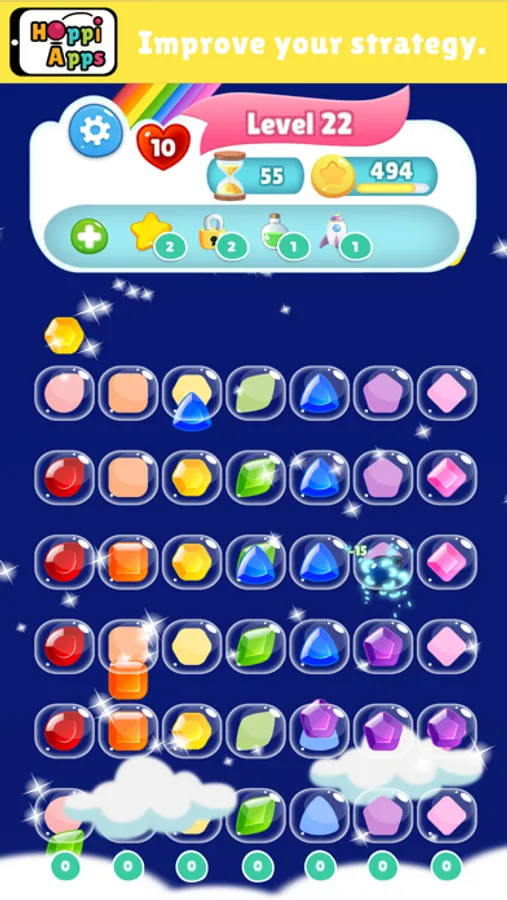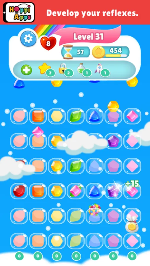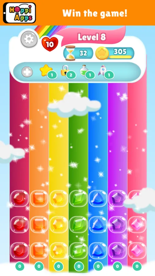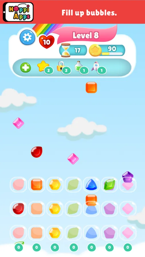 Catch the colored diamonds which fall from the sky in order to fill each bubble and thus, reconstruct the color palette of the rainbow. Develop winning strategies at each level.
