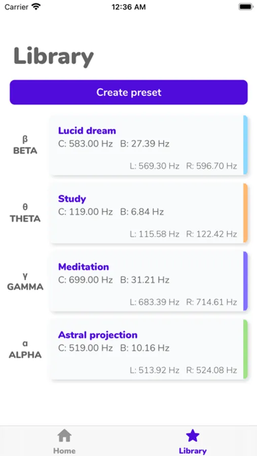 Create your own presets and save them in the library with the binaural beat generator. You just need to swipe to the left to erase them.