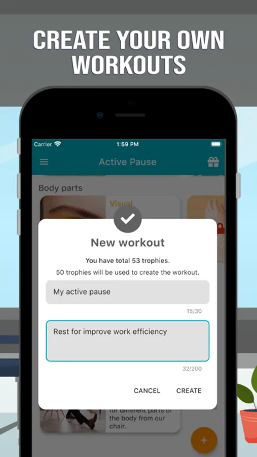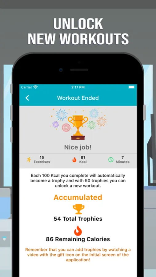 All workouts are made by professionals and you can do them in the comfort of your home. You start your training with 200 trophies, and you can earn more burning calories. Trophies helps you to unlock more workouts.