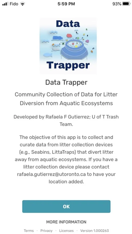 The objective of this app is to collect and curate data from litter collection devices (e.g., Seabins, LittaTraps) that divert litter away from aquatic ecosystems. Below you can find the type of information collected from this application:
