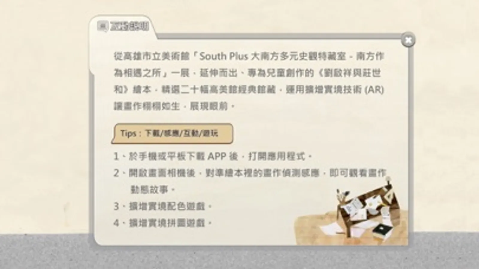 高美館期待從「特藏室AR繪本」出發,延伸藝術的觸角至不同的年齡層,讓各個年齡層都能親近藝術,故特別製作〈相逢在南方–繪本AR臺語讀本〉,搭配AR繪本動畫錄音,大家一起學習臺語之美。本書結合科技、藝術、音樂、插畫與語文,符合十二年國教課綱強調的跨領域精神,下載APP,讓它帶領你輕鬆體驗藝術,展開想像力的無窮魅力。