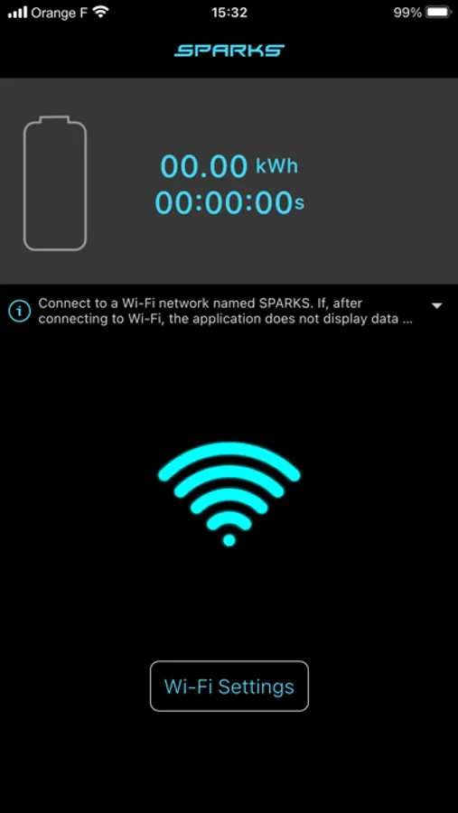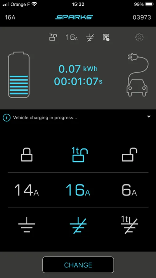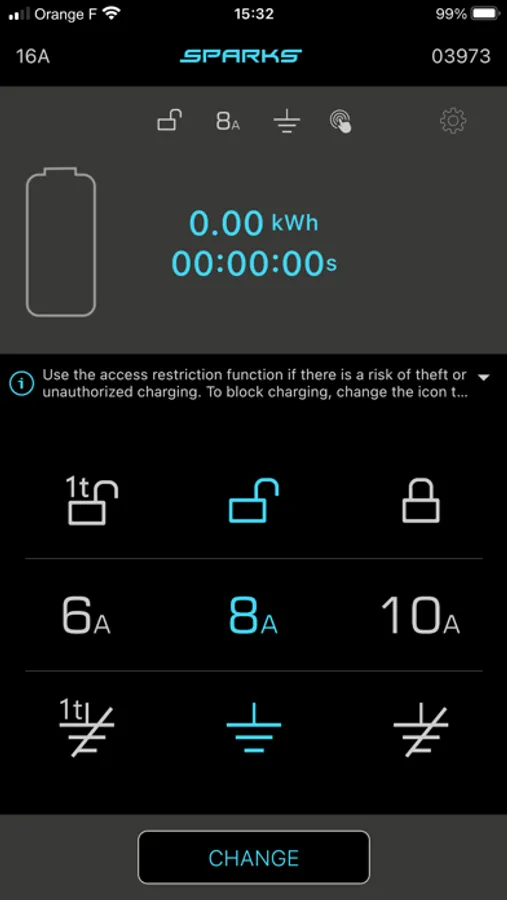 The SPARKS charging equipment is controlled through a direct Wi-Fi connection between the smartphone and the charger. The user can select the required combination of parameters for the charging session using the central screen rotating values. These parameters' changes occur only after pressing CHANGE button at the bottom of the screen. The current parameters of the charging session are indicated by the corresponding icons at the top of the app.