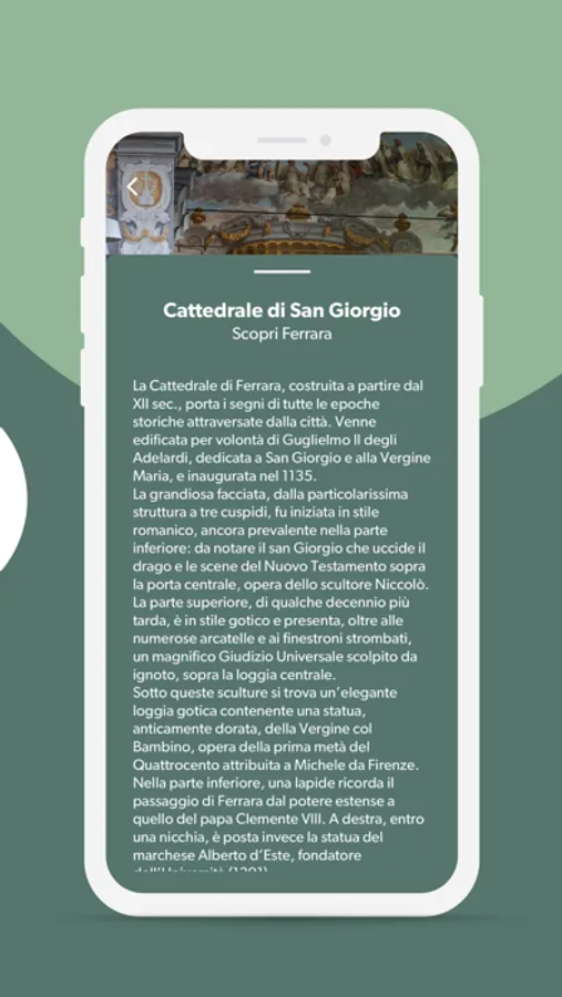 Diversi percorsi artistici, storici e culturali per esplorare le meraviglie di Ferrara fra luoghi, monumenti e personaggi. Un racconto ricco di immagini, panoramiche a 360°, testi di approfondimento e contenuti video ti permetterà di ammirare le opere d'arte e conoscere i protagonisti che hanno contribuito a creare la storia della città di Ferrara. Spostati tra i luoghi usando le mappe, seleziona il percorso e trova le tappe del tuo cammino, da fare a piedi ma anche in bicicletta, grazie a percorsi espressamente pensati per le due ruote. Potrai divertirti a rivivere i cambiamenti nel tempo, adottando anche punti di vista inediti.
