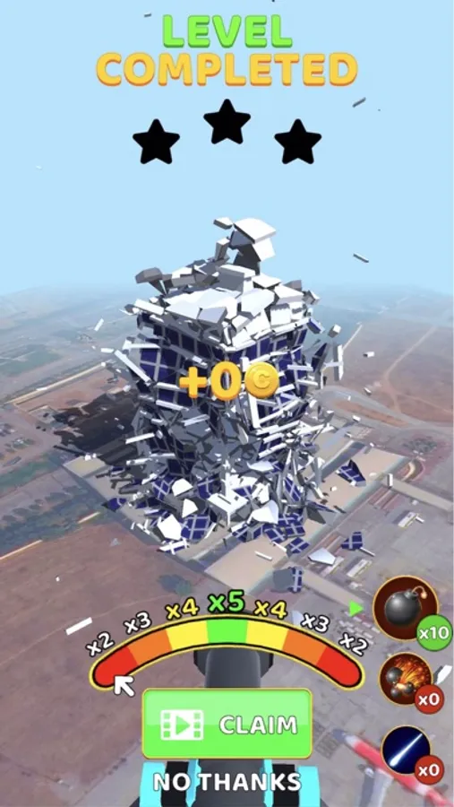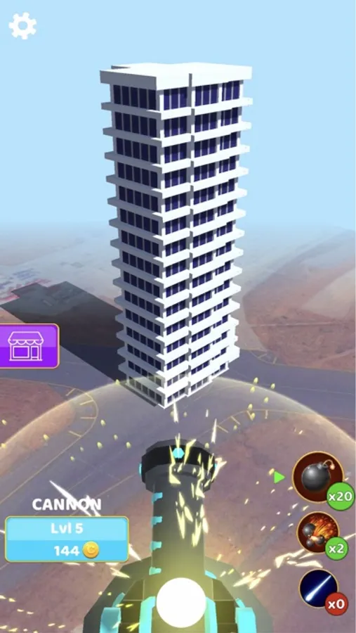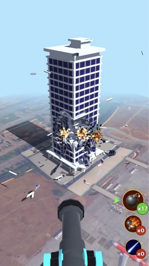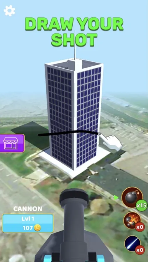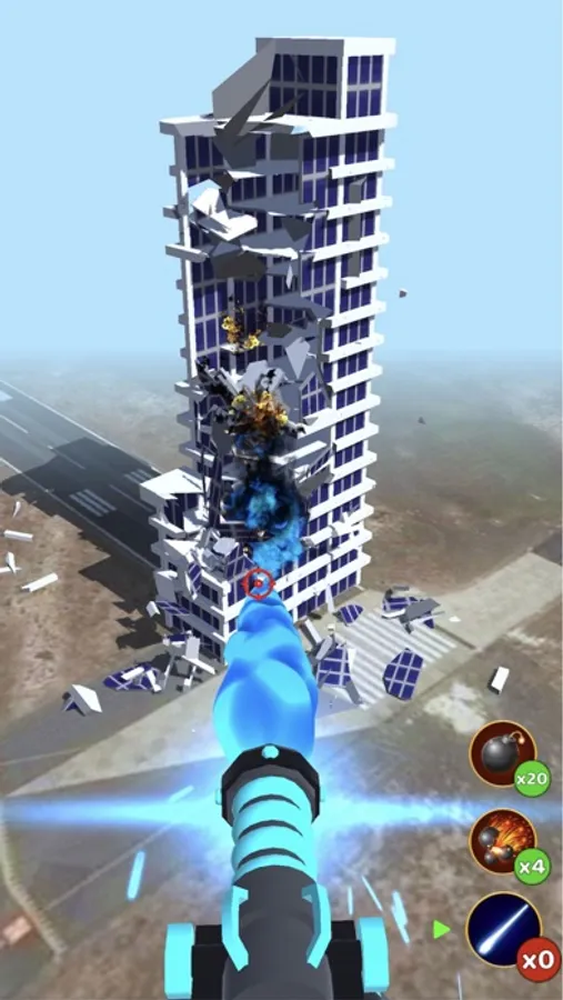 Drag on the screen to set the crosshairs and destroy the buildings.
