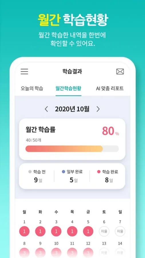 - 월간 해야 할 학습 계획 수와 월간 학습한 결과리포트를 제공합니다.