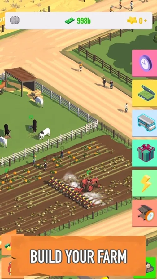 Can you run your Farm better than everyone else? This is your day, become the wealthiest farmer in the world. There is a lot of work to be done in the countryside, guide your farmers and become a countryside tycoon. Unlock different areas of the farm: peppers field, dairy area, sunflowers field, salad hotbed, wheat field, hayfield, apple trees, watermelons field, fish pond, carrots field, peaches, and much more. After your farmer finished all the work, he is attending the market to sold farm crops. The more villagers and areas you have unlocked, the richer you are. Get gems for achievements and use them to improve your game progress drastically.