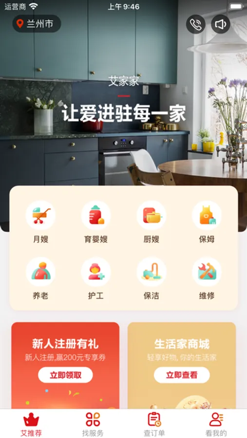 “艾家家”集接单、派单、评价等功能为一体,促进了管理科学化、服务快捷化和用工透明化。采取轻量化的设计风格,结合当下主流设计趋势,采用扁平化的设计风格。温暖的品牌调性,给用户带来充分的信任感。