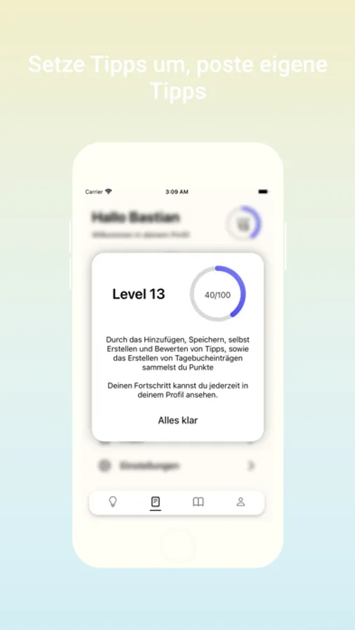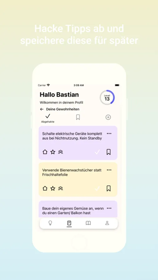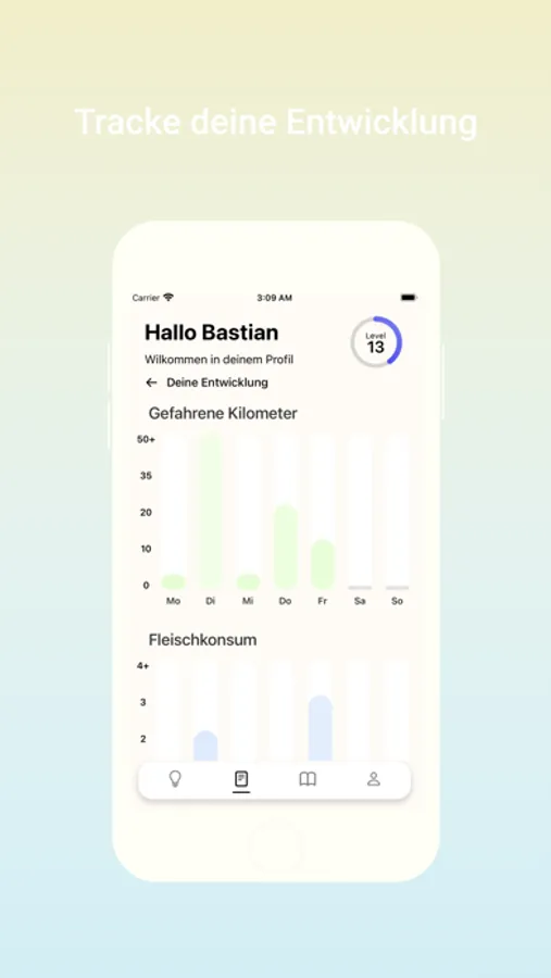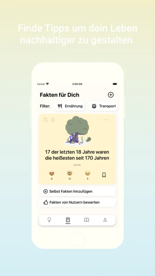 Du bekommst Tipps mit Handlungsalternativen, wie du dein Leben nachhaltiger gestalten kannst. Diese werden von ausgewählten Experten als auch von den Nutzern der App erstellt und für alle Nutzer angezeigt. Fakten über die Umwelt werden ebenfalls angezeigt. Dazu kannst du jeden Tag dein Verhalten in deine Tagebuch eintragen und den Fortschritt und deine Entwicklung in deinem Profil einsehen.