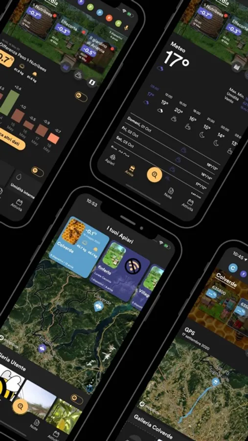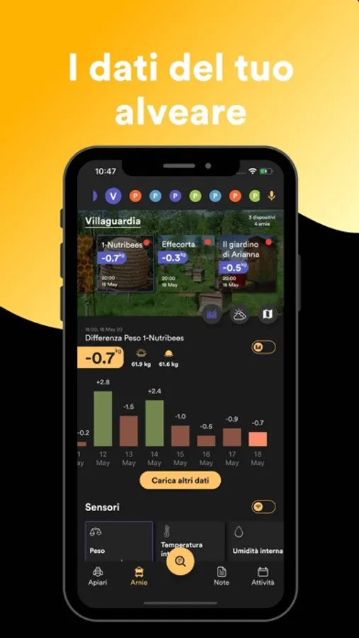 Collegando la tua APP alle bilance 3Bee potrai monitorare costantemente da remoto i tuoi alveari e le tue api. Avrai sempre sotto controllo i parametri interni più importanti del tuo alveare: il peso, la temperatura interna/esterna, la frequenza sonora, l'umidità interna/esterna, le previsioni meteo.