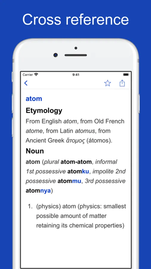 Malay words are listed with detailed etymology and meaning. Entries are cross-referenced to other entries.