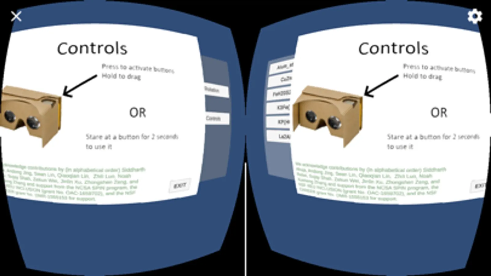 Materials VR uses virtual reality to help students visualize molecular structures. Molecules can be selected from a list and rotated or moved around by the user. The Google Cardboard version includes gaze input which allows the user to gaze at a button for 2 seconds to interact with it.