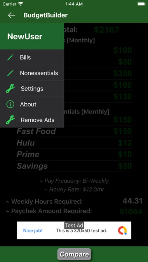 BudgetBuilder's main menu provides helpful information such as how many hours the user will need to work in order to meet their monthly total, or if paid by salary then how much money is needed or leftover after the monthly total is applied to the monthly budget.