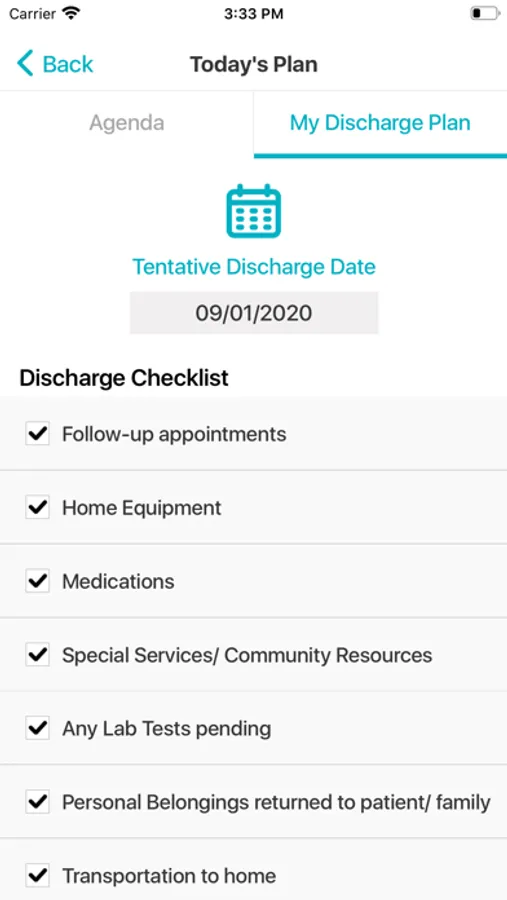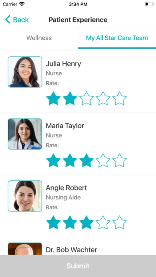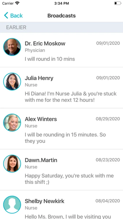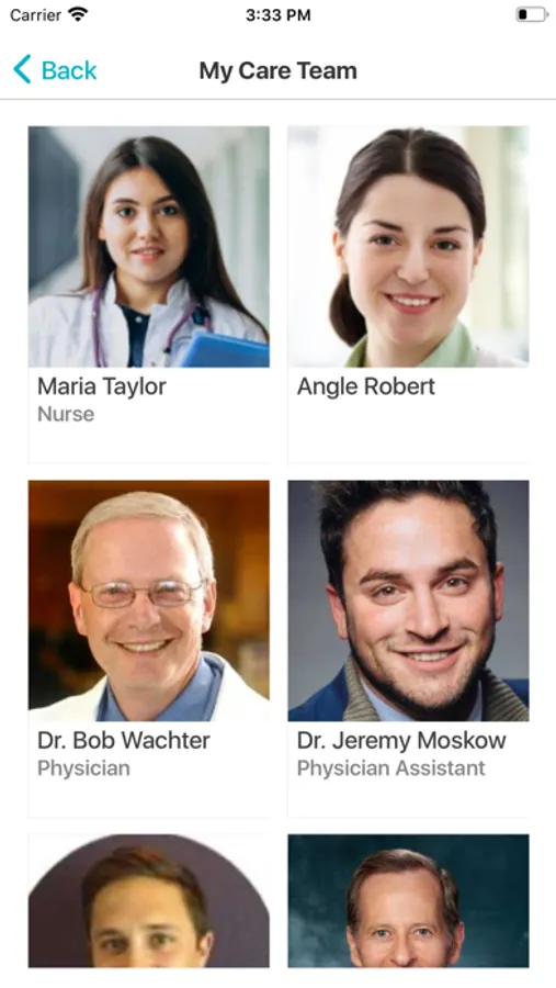 MiHealTeam replaces the traditional whiteboard. The healthcare professionals assigned to the patient are viewable in the “My Care Team” tile which is on the main dashboard of the app. In the “My Care Team” portion of the app, the patient's care team is shown with the staff members' name, title, and high-resolution photo.