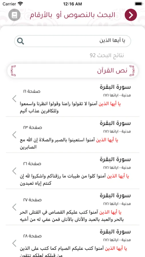 * التفاعل مع نص القرآن بالخط العثماني على مستوى الآية مما يتيح للمستخدم التفاعل مع آيات المصحف بدلا عن صفحاته.