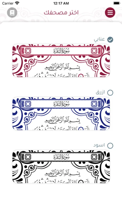 ١- اختيار من بين 3 ألوان للتطبيق (العنابي، أزرق غامق ، أسود ملكي) لمساعدة على تلاوة القرآن الكريم.