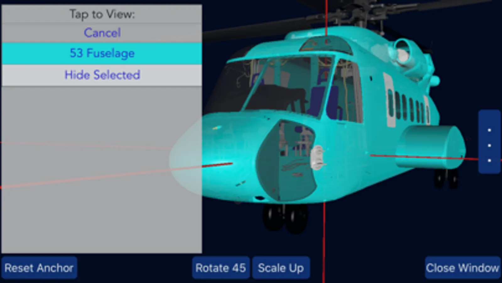 The Mobile PLA provides Plug/Part Locator App (PLA) functionality for the S-92TM helicopter, with both 2D and 3D views available when viewing locations of search results.