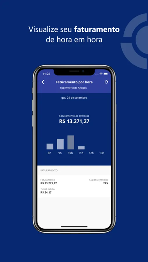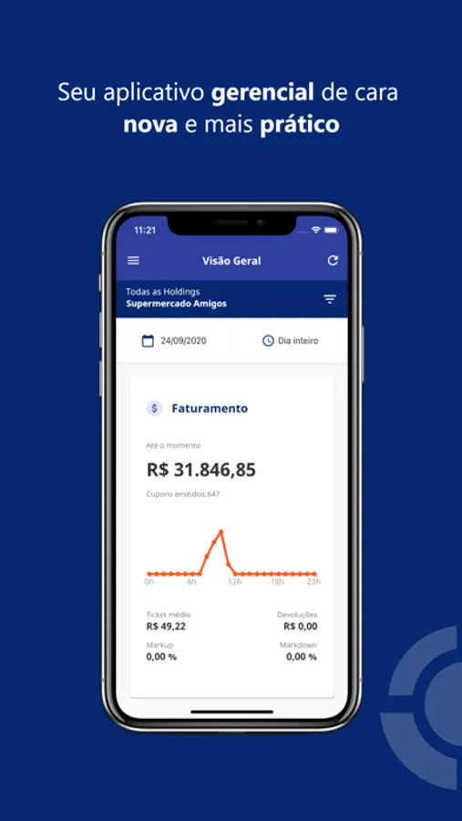 - Visão geral de faturamento com informação de valor vendido, devoluções, ticket médio e quantidade de cupons emitidos.