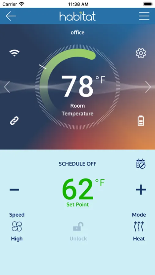 With one-touch, all the operational details related to the selected Habitat Thermostat are displayed on a single page with clear, easy to understand icons. more…