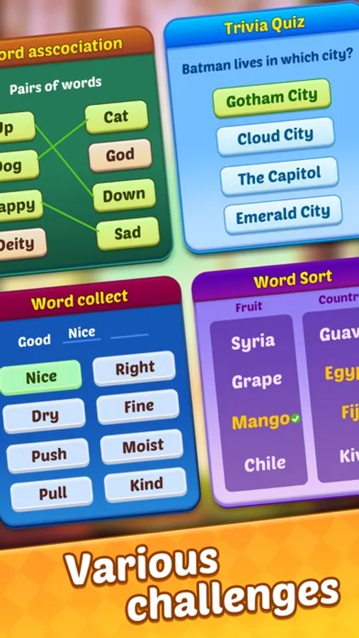 Spell words by limited letters and then use magic cards to associate them with their synonyms, antonyms or homonyms. 'W' or 'Double U'? You can also find solutions inside the letters.