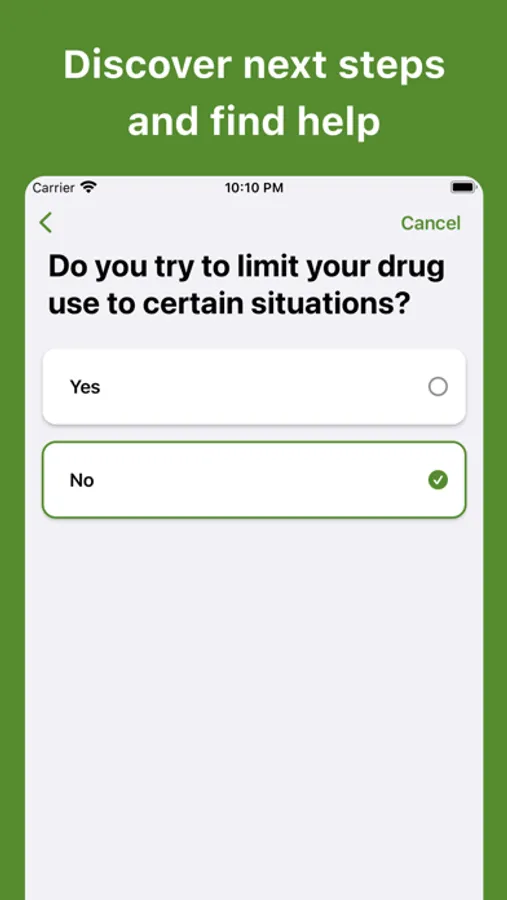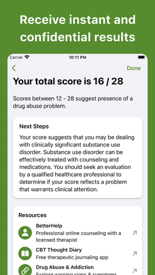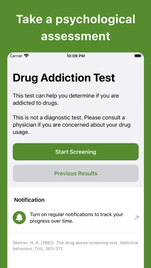 Concerned about your substance use? This app helps you evaluate whether or not you may be addicted to drugs. It uses the Drug Abuse Screening Test, a validated screening questionnaire.