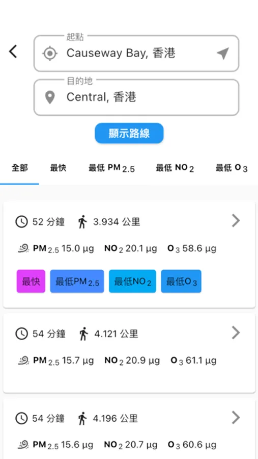 2. Suggest alternative travel routes according to expected exposure to air pollution.