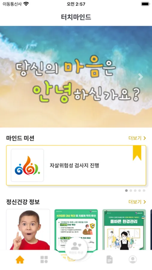 전라남도광역정신건강복지센터에서 제공하는 '터치마인드'은 정신건강 검진, 무료상담센터(정신건강복지센터)로 연결 가능, 치료기관 안내 및 다양한 정보를 제공하는 정신건강 앱입니다.