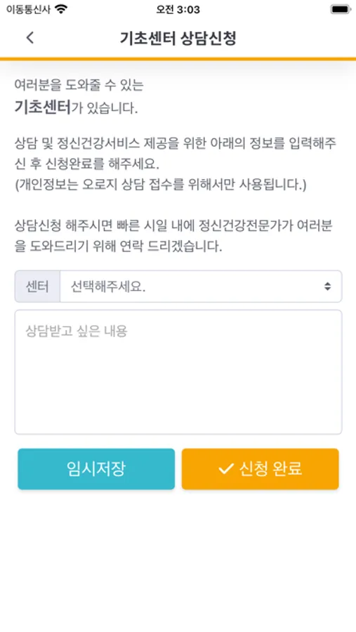 무료상담 및 심층평가를 받을 수 있는 정신건강복지센터에 대한 정보제공하고, 필요에 따라 상담신청을 하실 수 있습니다. 상담신청 후 정신건강복지센터에 여러분에게 연락 후 정신건강 서비스 및 전문의 1:1 상담 등을 받을 수 있습니다.