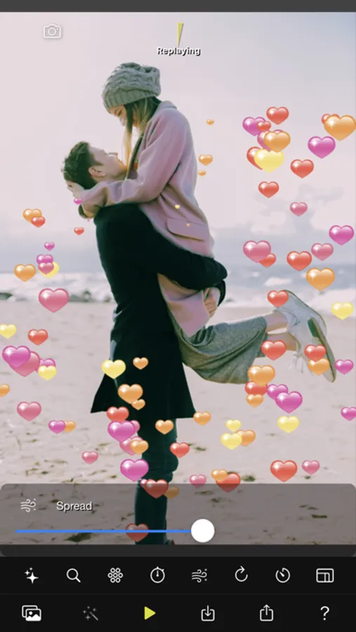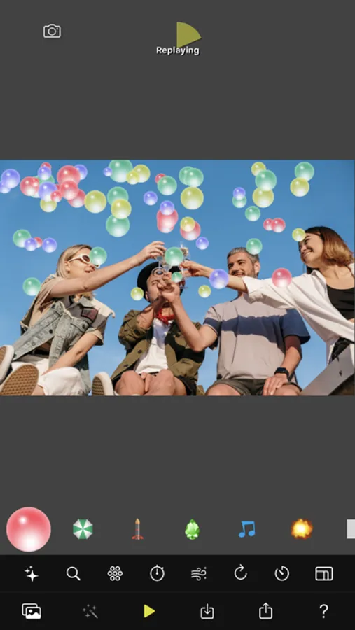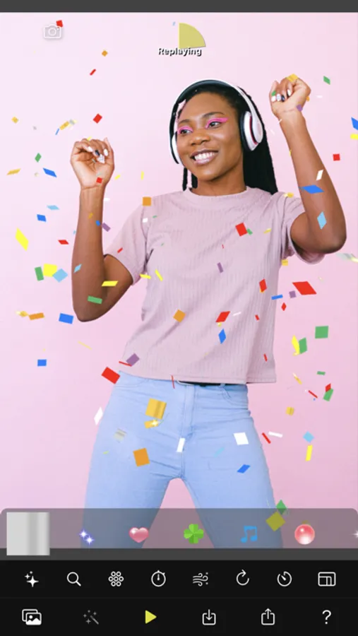 Glitter (white) / Glitter (color) / Confetti / Balloons / Soap bubbles / Musical Notes / Hearts / Flower showers / Roses / Jewels / Rocket balloons / Paper planes / Bills / Cherry blossoms / Maple / Ginkgo / Dandelion fluff / Four leaves / Young leaves / Firefly / Snow / Explosion / Smoke / Feather / Coin / Umbrella / Drone / Darts / ...