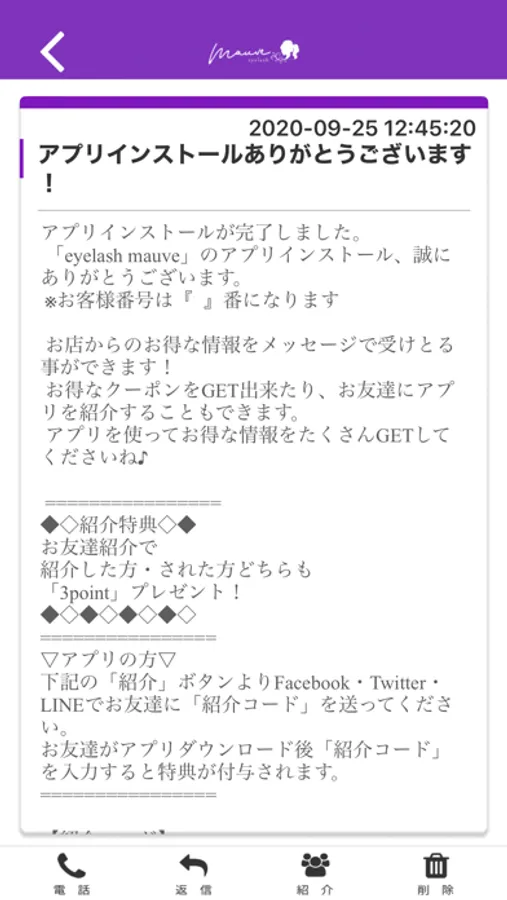 eyelashmauveのアプリをSNSを通じてお友達に紹介する事ができます。