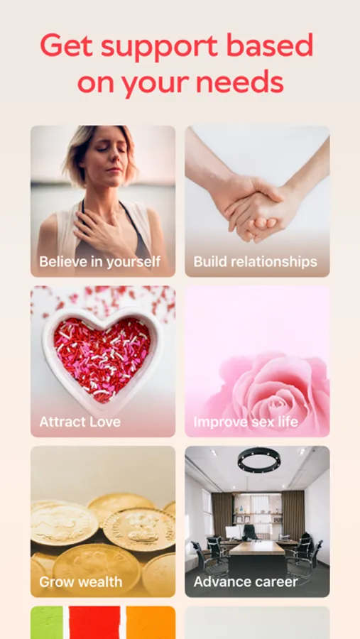 We have chosen the most relevant topics for your daily affirmations: yourself, gratitude, wealth, career, sex life, creativity, focus, changes, and many others.