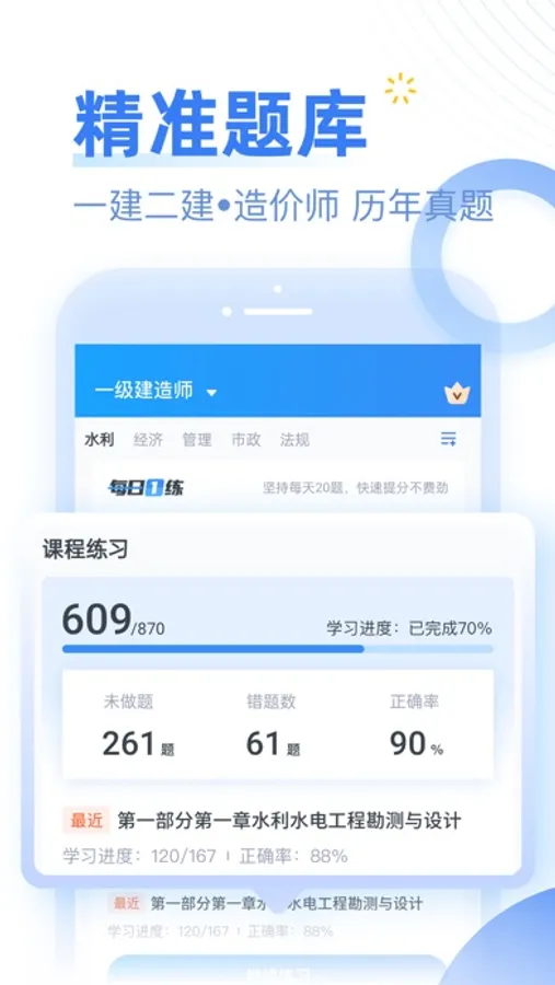 “历年真题+模拟考点金题”题库完整版 实时更新:一建、二建、造价、经济师、会计职称、注册会计师、执业药师/医师、教师公考等历年真题试卷,所有真题“免费练+考点精讲+精编解析+章节练习”,面对错题及时解决搞懂,充分利用碎片化时间来提高知识点的熟练程度。