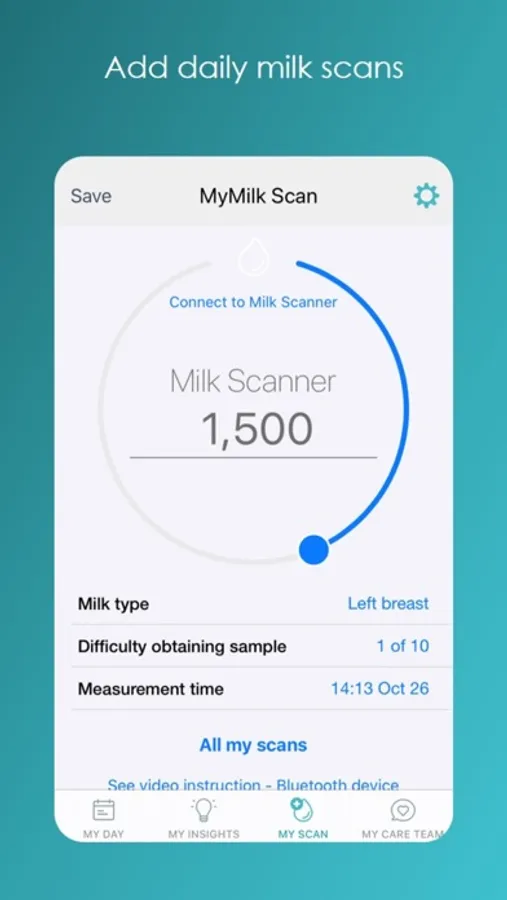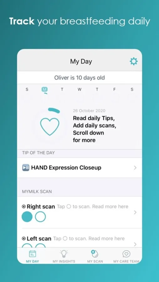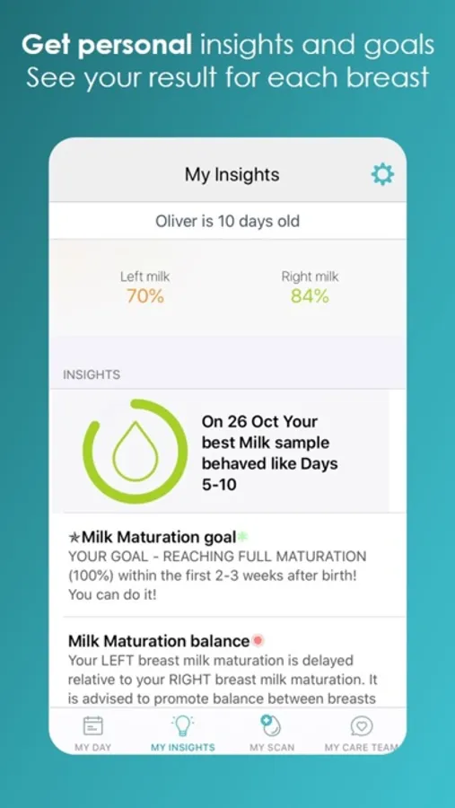 Engage daily and get daily Tips & Education Videos for good breastfeeding practice matched to baby age; Complete daily quizzes and data logging, about breastfeeding practice, breast pain, baby weights, pumping and additional mother-baby indicators. The app integrates milk scan results with your additional logged data for generating personalized enhanced insights. The more you log, the personal it gets. Feature leverages Apple's CareKit framework to enhance compliance for daily data tracking.