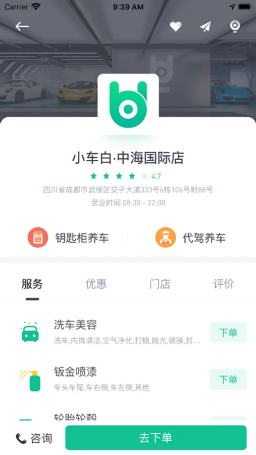 精选车服门店,为车主提供一站式智能养车新体验,服务过程全程直播,无接触托管养车省时省心、安全便捷。