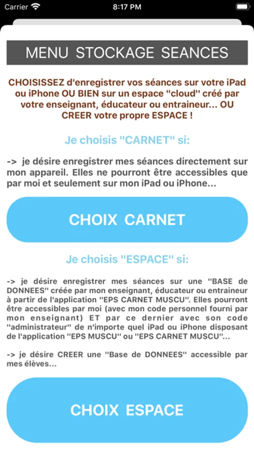 En effet, l’application « EPS Muscu » autorise le dépôt, la récupération et l’évaluation des séances sur une base de données qui ne peut être créée qu’avec l’application « EPS Carnet Muscu ». Par contre, si effectivement l’enseignant doit obligatoirement organiser ses espaces partagés avec « EPS Carnet Muscu », ses élèves n’ont besoin que de l’application de base « EPS Muscu » pour y accéder afin de déposer après chaque séance de musculation (avec leur mot de passe « élève »), le travail effectué, des commentaires éventuels, l’état de forme ou leur ressenti.