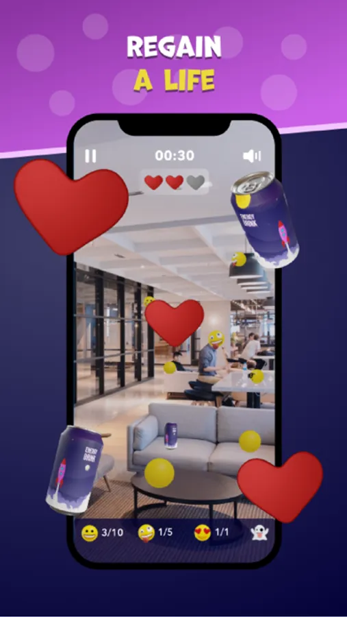 At the beginning, we'll choose 3 smileys that you'll collect among all the others. And because they’re randomly placed in space, you can move around them to look them directly in the face. After all, if you choose the wrong one, you’ll lose a life. When the gong sounds, all the smileys will turn around to confuse you. Try not to lose all 3 of your lives during the game. If you find a can of Coca Cola, you’ll regain one lost life. When you catch a ghost, you’ll get extra time. Don’t forget that your goal is to catch all the selected smileys in the shortest possible time.